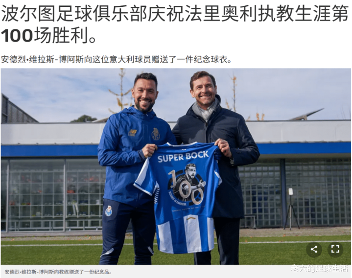 波尔图这边上场面对通德拉的联赛顺利的取得了胜利之后,俱乐部的主席博阿斯亲自赠送主教练法里奥利一件纪念球衣,来庆祝他执教生涯的第100场胜利。